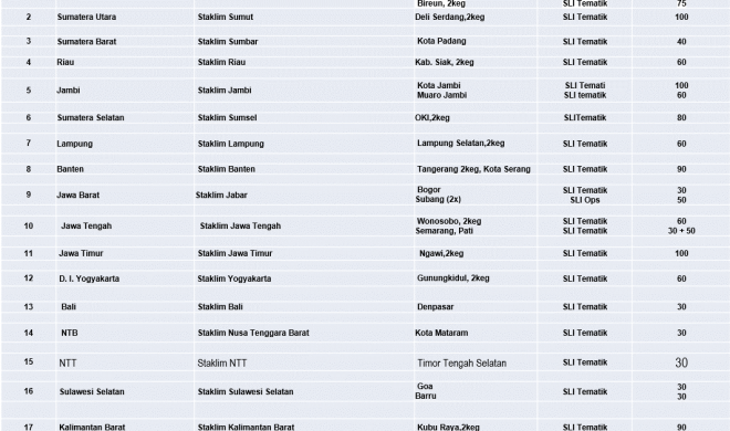 Berikut sebaran capaian Sekolah Lapang Iklim Prioritas Nasional tahun 2025 sampai dengan bulan Desember. Berdasarkan monitoring pelaksanaan kegiatan Sekolah Lapang iklim tersebut terdapat dua jenis kegiatan SLI yaitu SLI Operasional sebanyak 2 kali dan SLI Tematik sebanyak 50 kali, dengan total peserta secara keseluruhan berjumalh 1950 orang. Sedangkan jumlah realisasi anggaran kegiatan SLI secara nasional s/d 31 Desember 2025 adalah sebesar Rp. 2.748.983.459 (98,5%). Dari sebaran peta kegiatan diatas, dapat dikatakan bahwa kegiatan SLI yang bekerjasama dengan stasiun klimatologi di setiap provinsi telah dilaksanakan secara merata meliputi seluruh kepulauan di Indonesia dengan hasil yang mengembirakan karena hamper setiap pelaksanaan kegiatannya berjalan dengan lancer dam sukses.